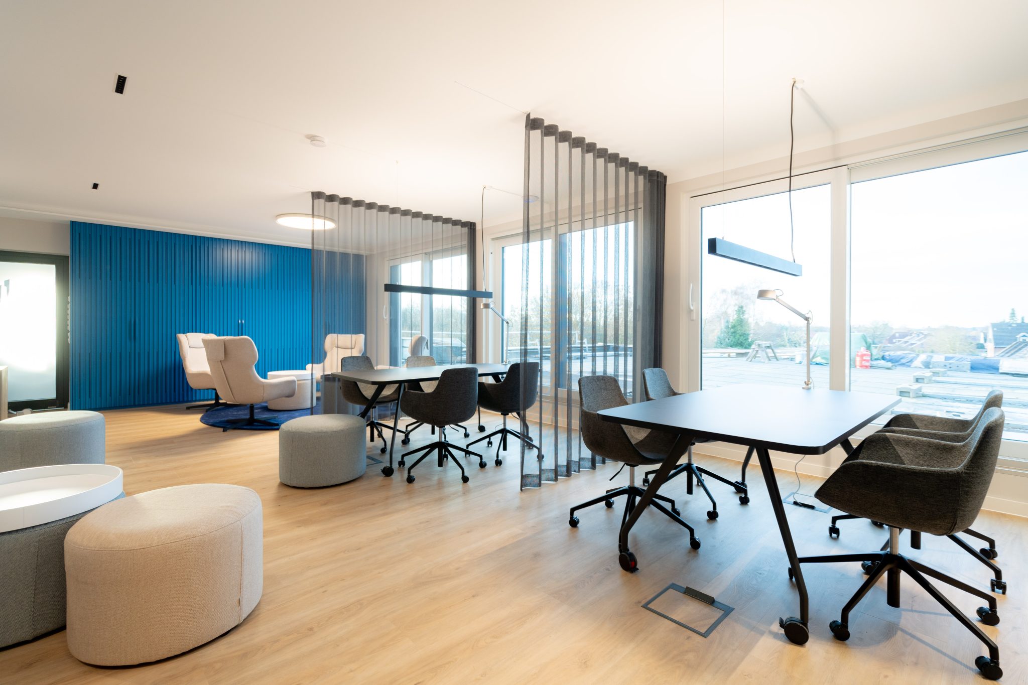 Gestalterisch wurde die CI-Farbe Blau gezielt als identitätsstiftendes Element eingesetzt und mit einer ruhigen, hochwertigen Materialpalette aus Holz, Textilien und matten Oberflächen kombiniert. Das gemeinsam mit einem Lichtplaner entwickelte Lichtkonzept unterstützt konzentriertes Arbeiten ebenso wie Schulungs- und Präsentationssituationen.