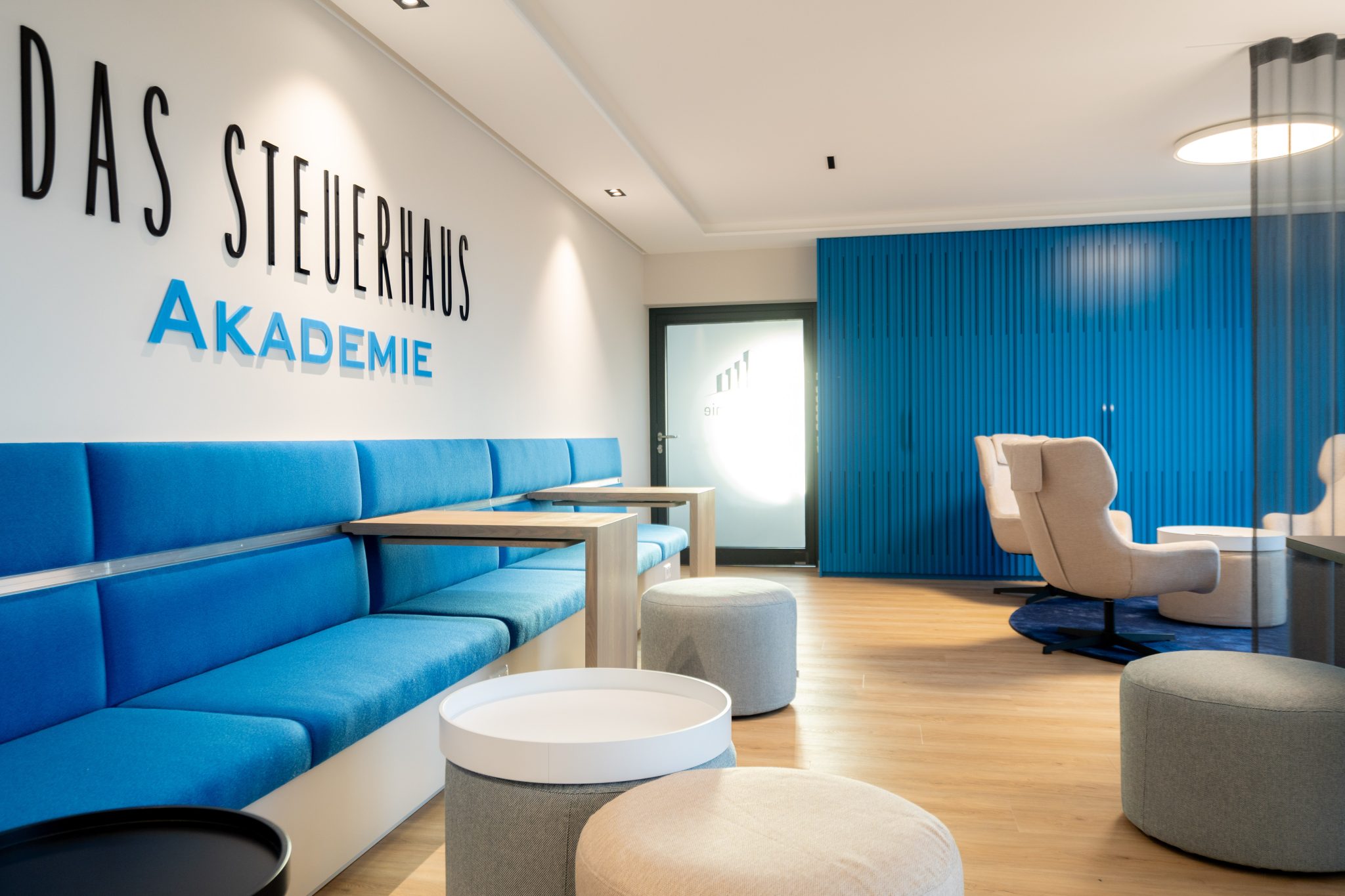 Für das Steuerhaus planten und realisierten wir einen modernen Akademie- und Schulungsraum, der flexible Lern- und Arbeitssituationen in einem klar strukturierten, hochwertigen Umfeld ermöglicht. Offene Arbeitszonen, Rückzugsbereiche und kommunikative Elemente sind miteinander verknüpft.